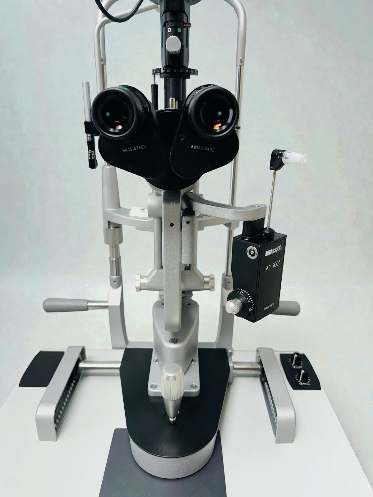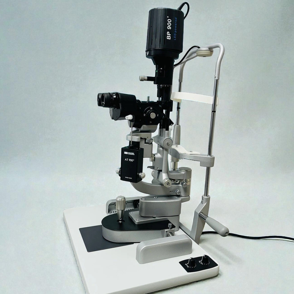 - AT 900 Goldmann applanation tonometer included — The AT 900 is the Goldmann tonometer that the WHO designates as the reference standard for clinical IOP measurement; having it mounted and calibrated as a unit with the slit lamp eliminates the per-exam setup time and calibration variability of tonometer attachment systems.
